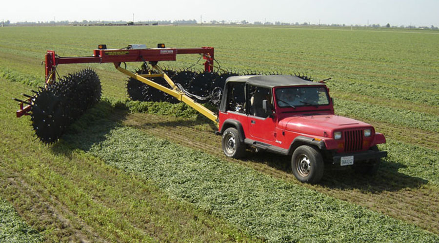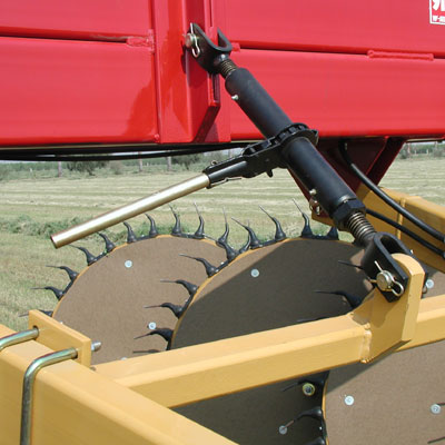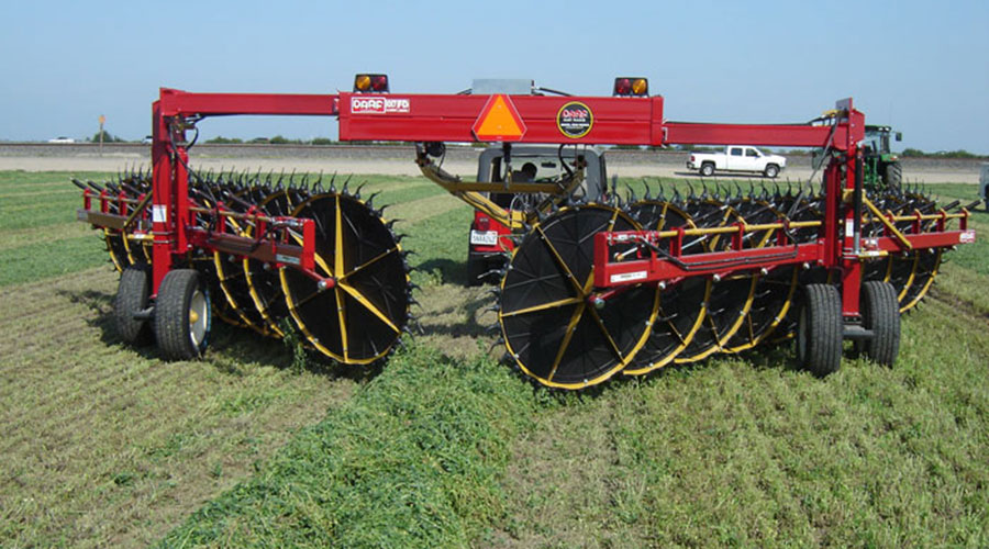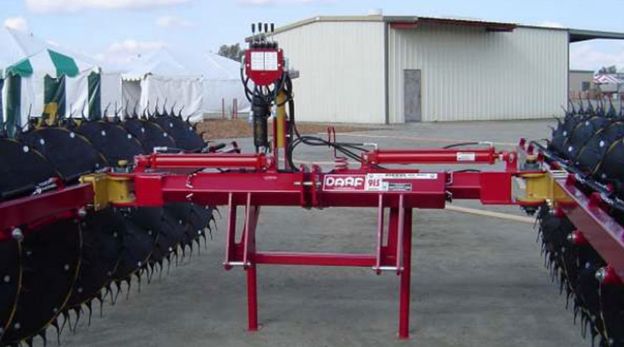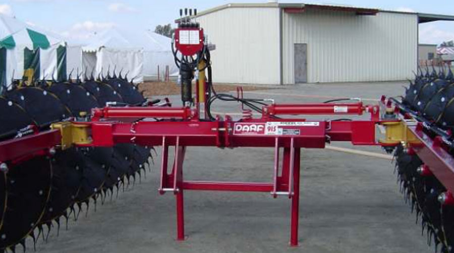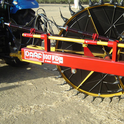 The DARF FD Model hay rake allows the operator to perform all functions from the tractor cab. Large, easy-to-use toggle switches on the fingertip controls open and close the rake, change raking angles and raise and lower raking wheels.