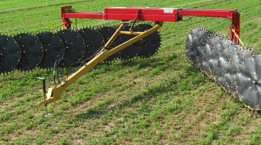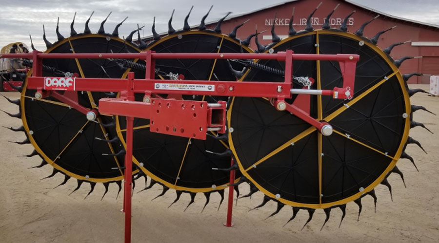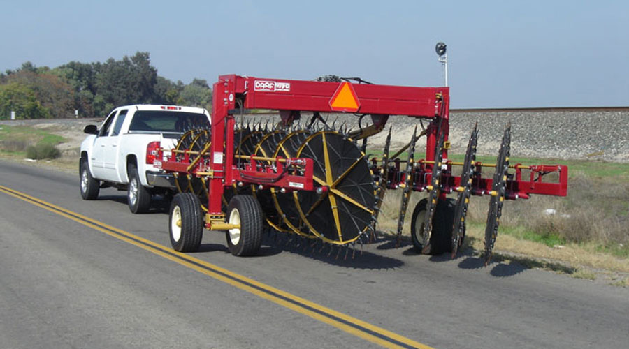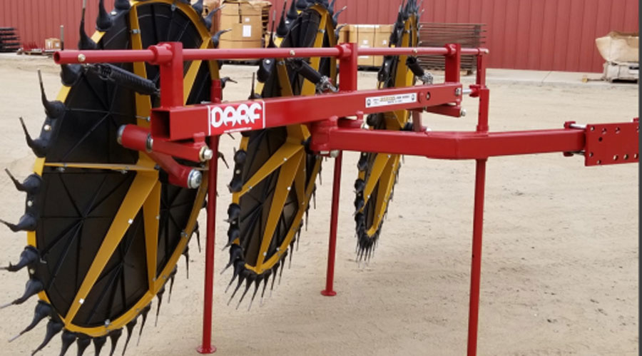Rear-Mounted Turning Rake | Darf 3 point mounted turning rakes reduce hay curing time. Wet harvest years make this machine a must in grain as well as hay. 3 wheel model will handle up to 65” windrows, 4 wheel up to 84”. Features Cat. 1 3 pt. and swings behind tractor for transport.